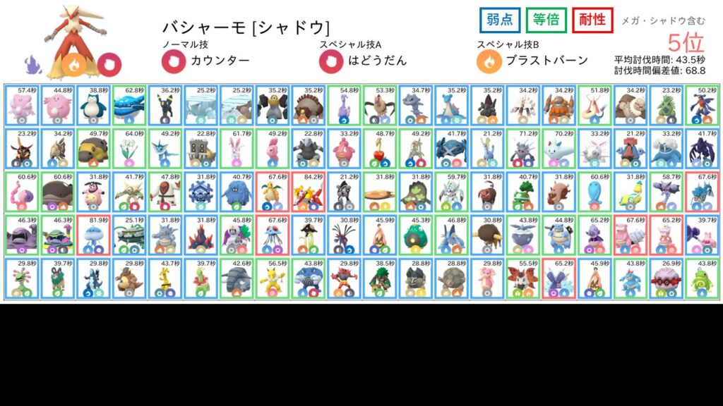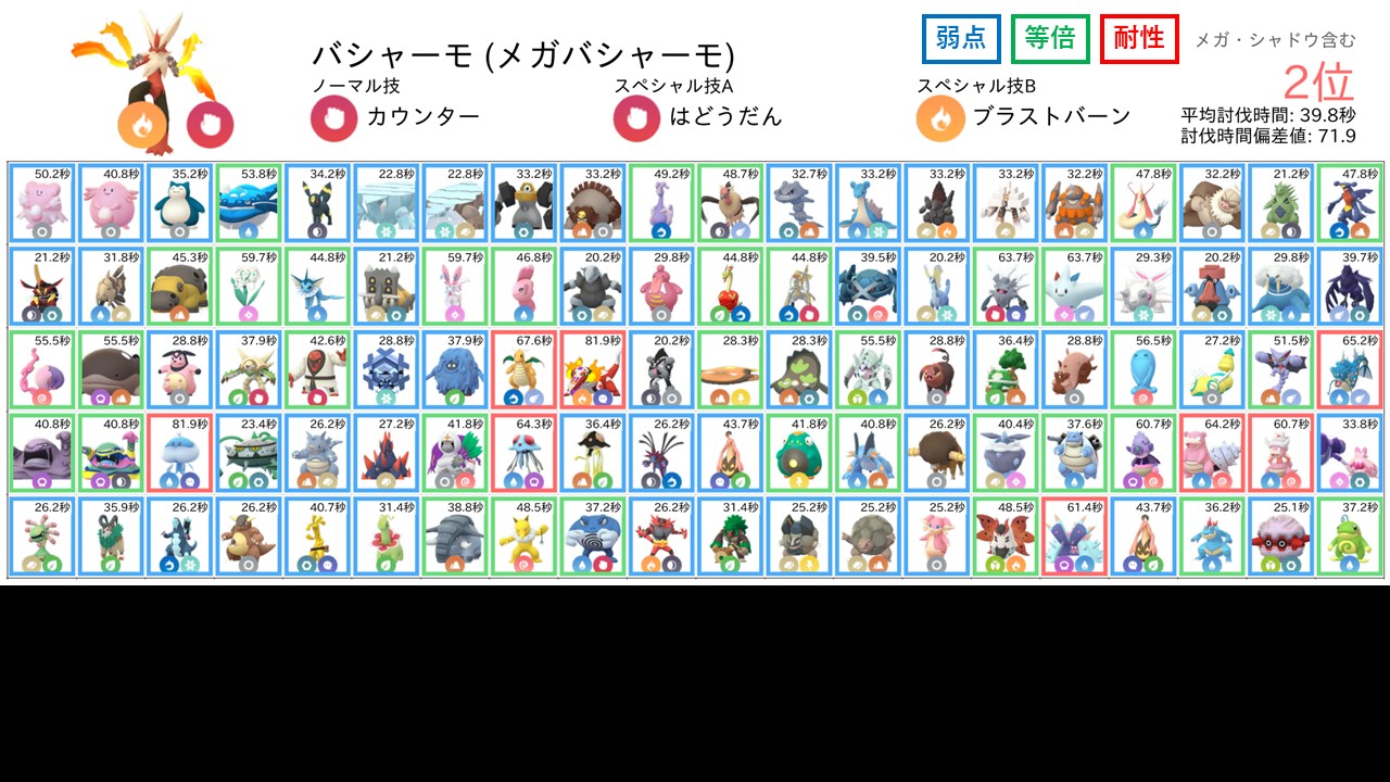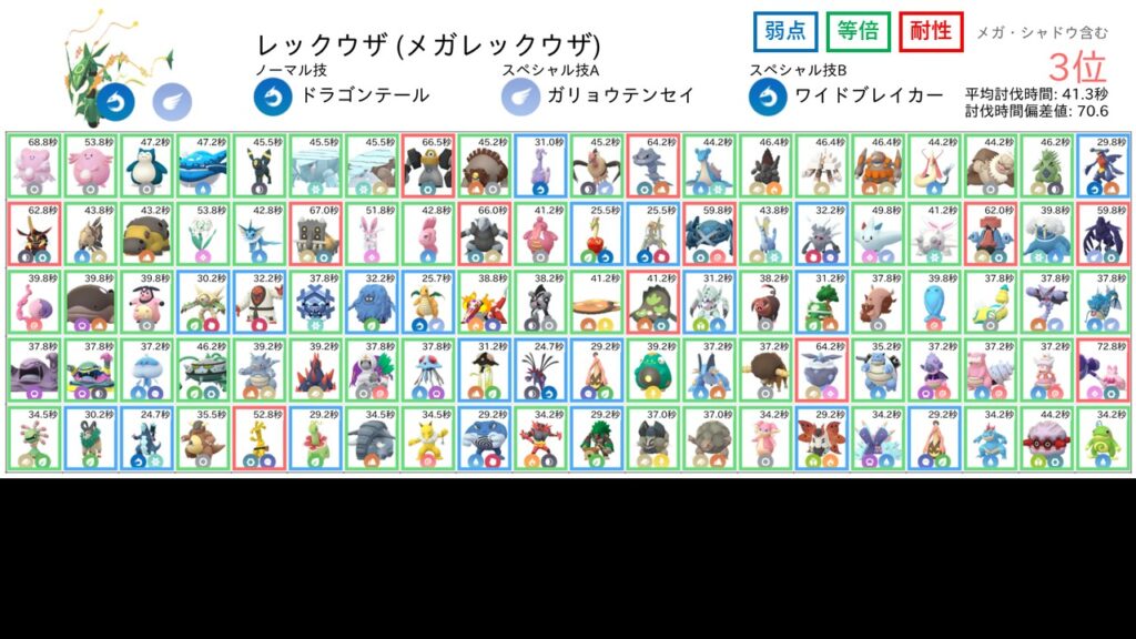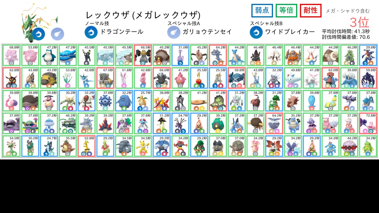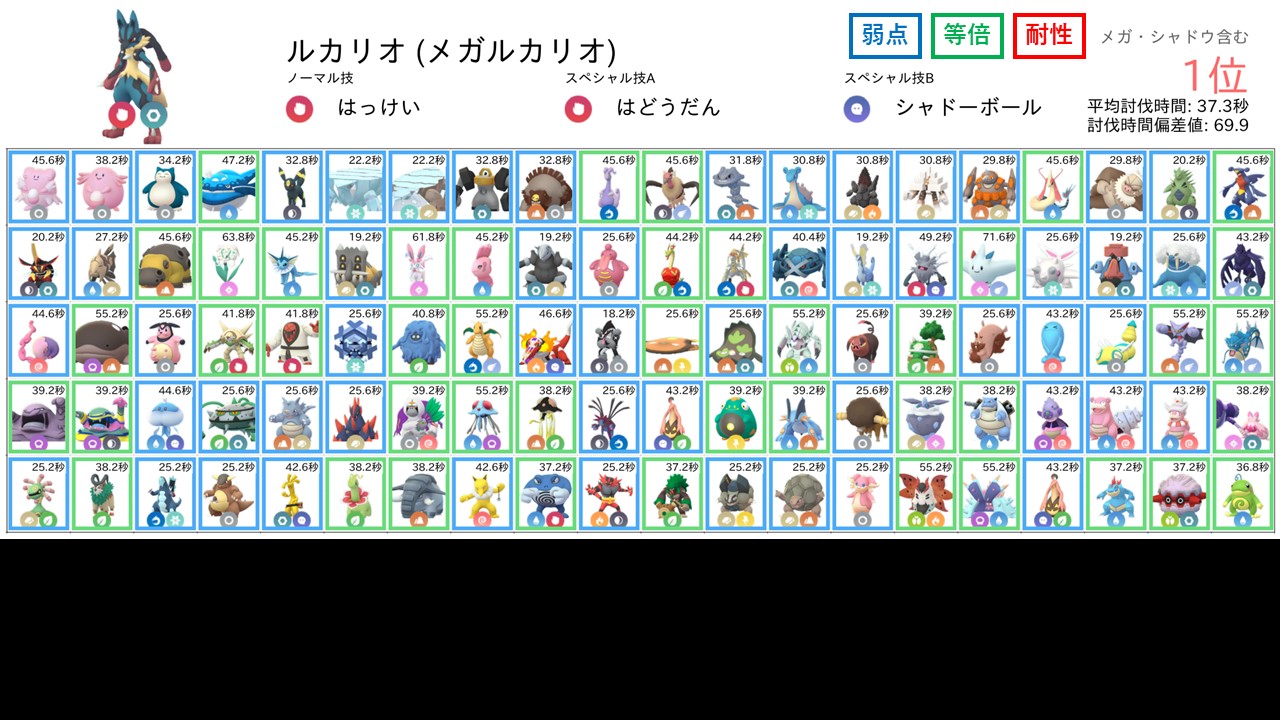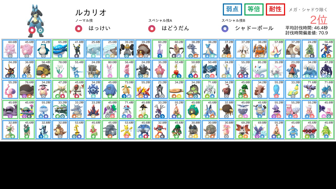 なお、各防衛ポケモンに対する相性は以下のように色分けして表示しています。