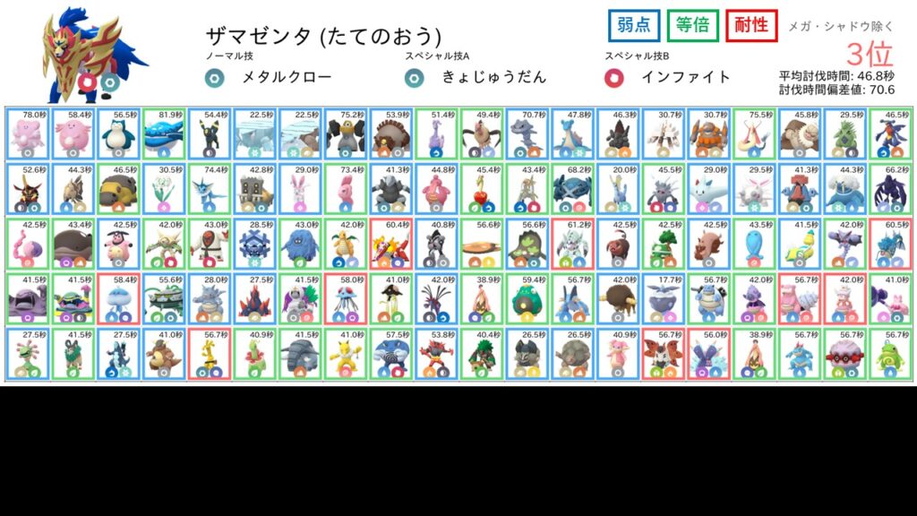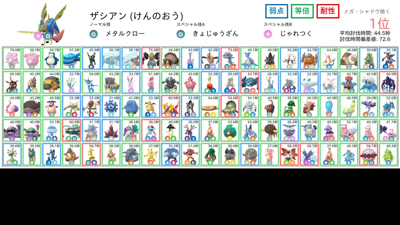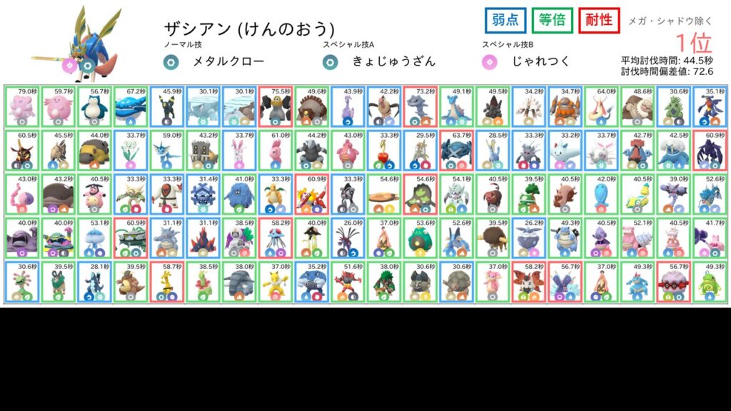 しかし、ザシアン けんのおうは攻撃が非常に高いポケモンなので、耐性を取られてもなお速い3周討伐速度を記録することができたということで、栄えある第1位になったと考えられます。