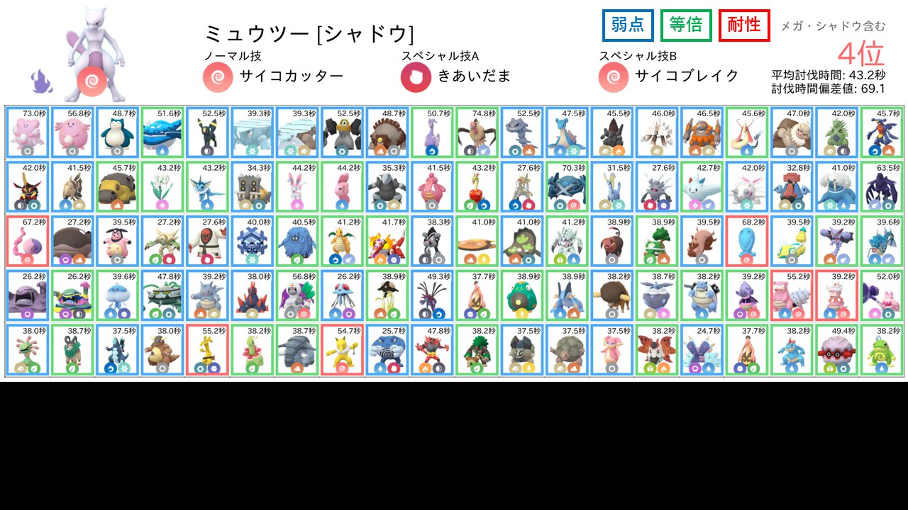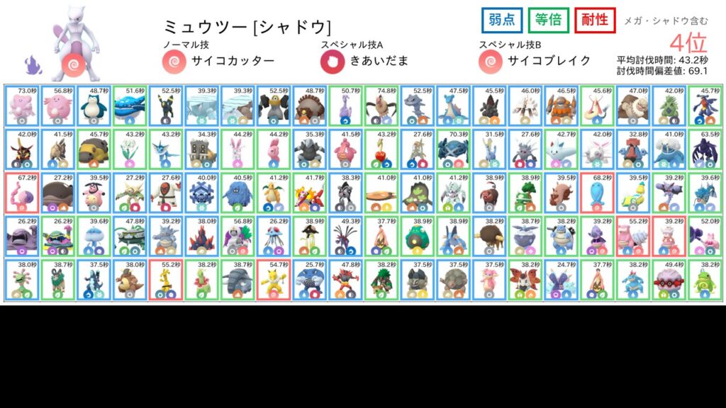 しかし、シャドウミュウツーの圧倒的な攻撃力の高さに加えて、サイコブレイクという非常に優秀な2ゲージ技を使えるといったことから、耐性関係なく今回は総合第4位の結果に落ち着いたと考えられます。