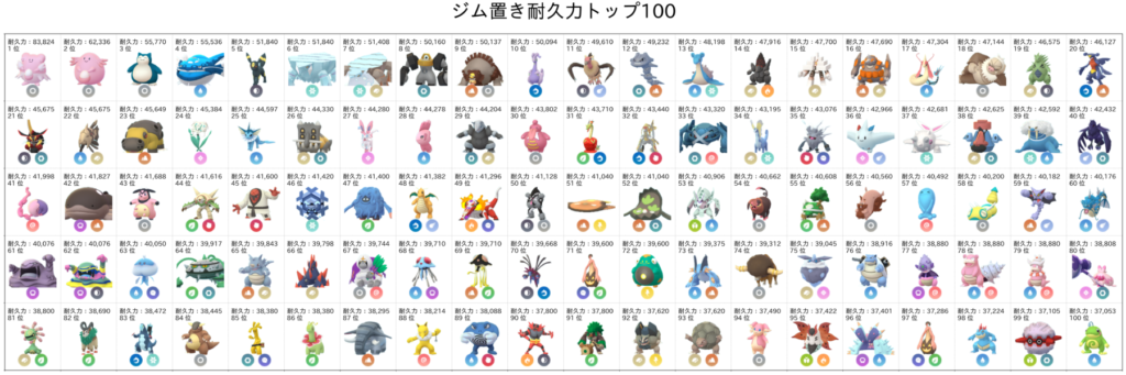 今回、どのポケモンが最速なのかを考えるにあたって、ジムに置かれるポケモンで耐久力が高いポケモントップ100を計算の対象としました。