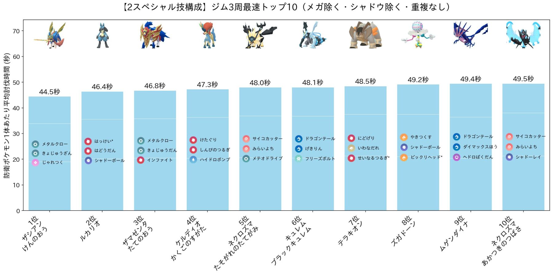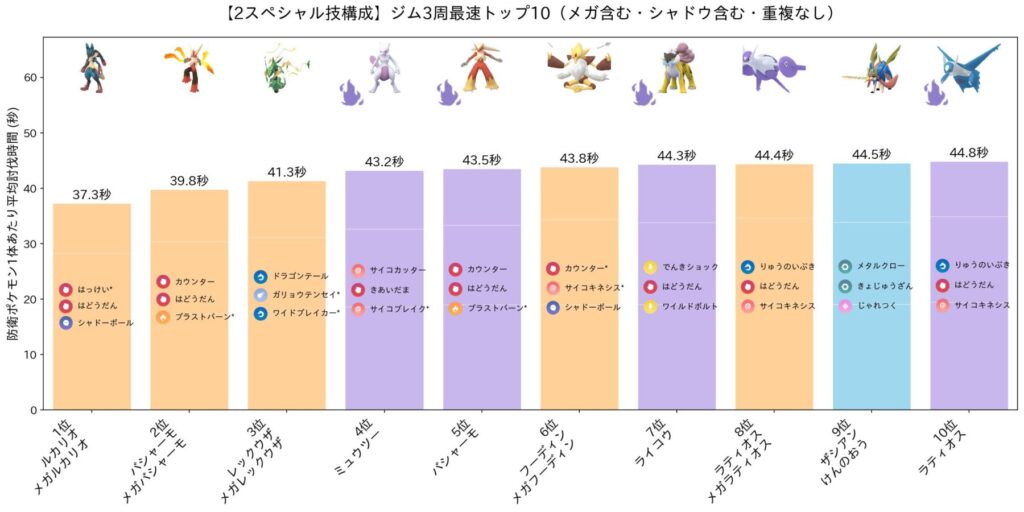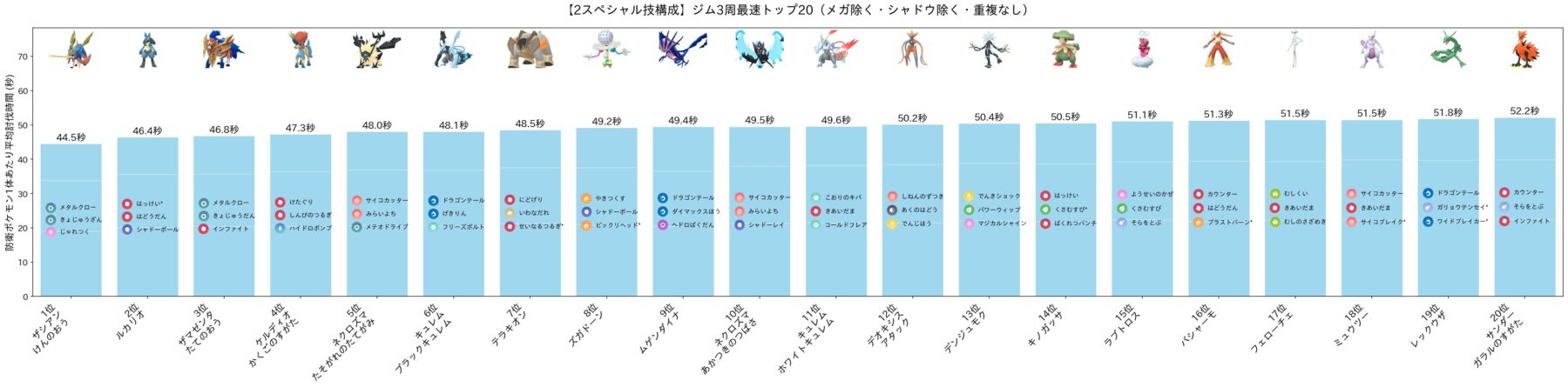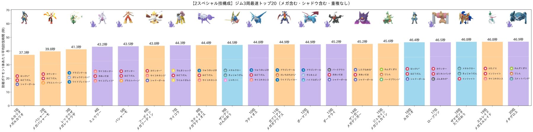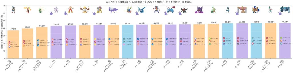 参考までに、メガ・シャドウを含む全ポケモンの平均討伐時間のトップ20を紹介します!まさに群雄割拠。