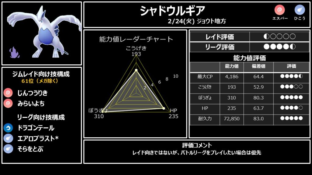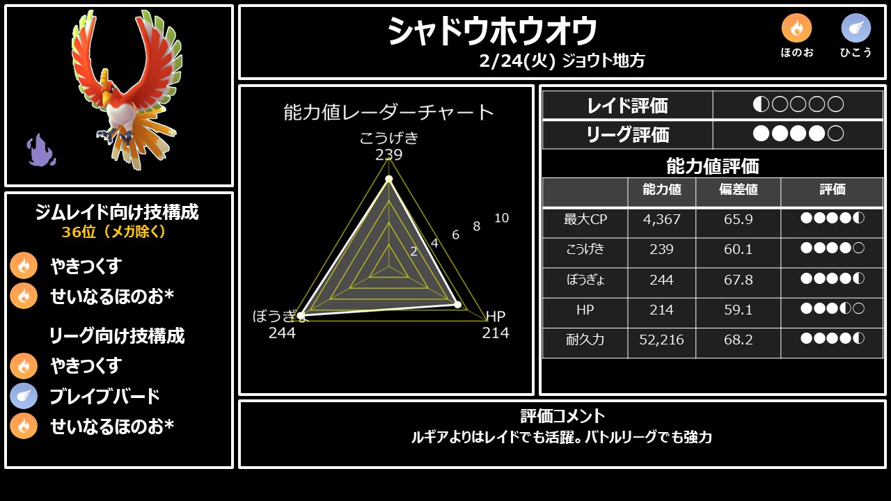 ・2/24(火) ジョウト → シャドウホウオウ優先。マスターリーグ向き。