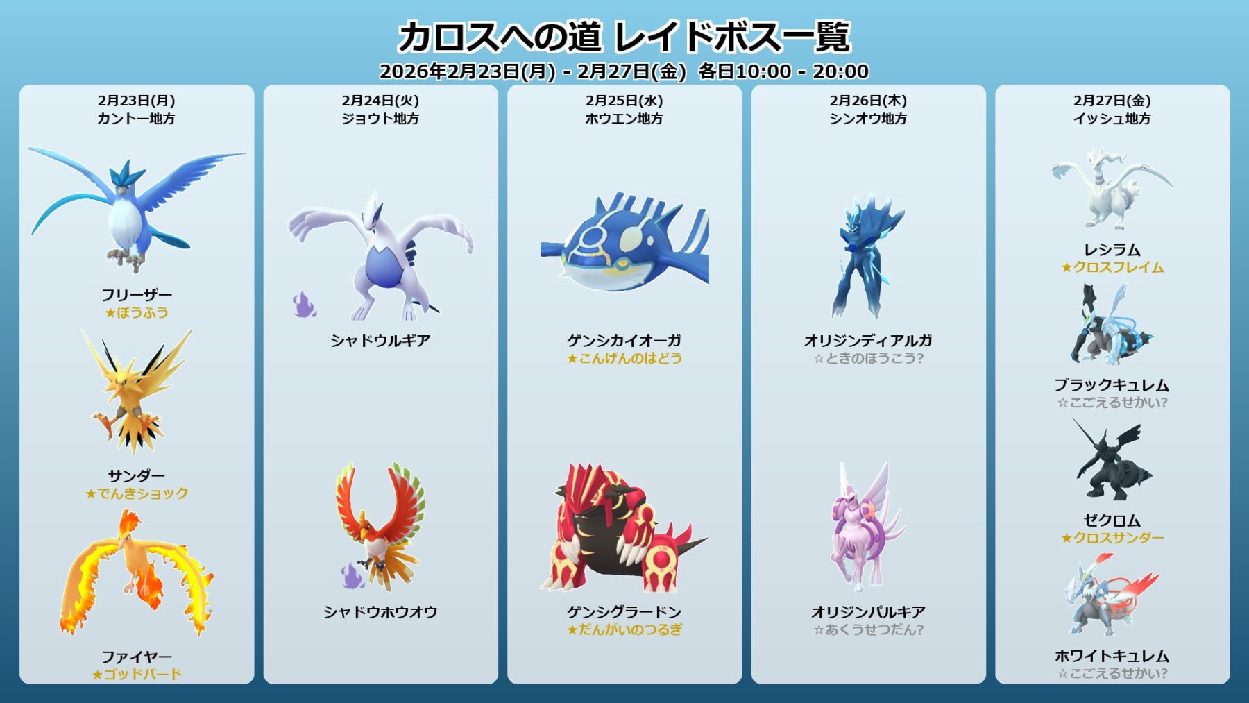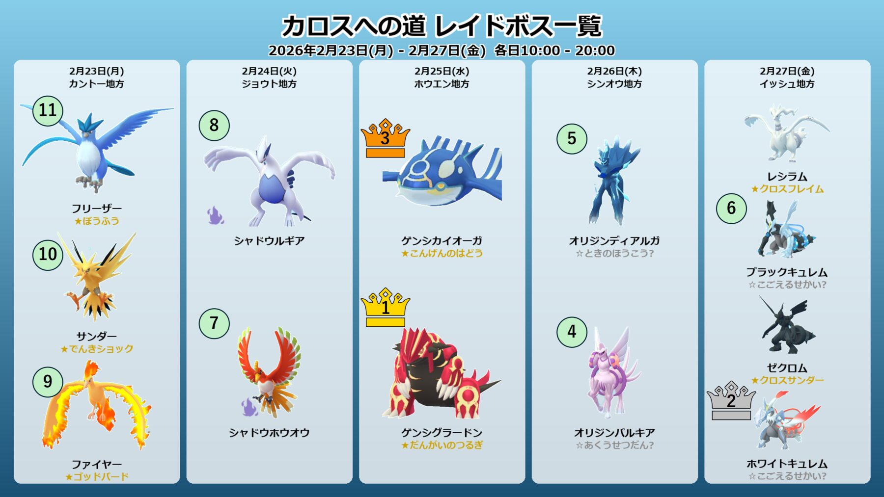 迷ったら2月25日のゲンシ2匹に全力投球。次点で2月26日のパルキアと2月27日のキュレム合体です。