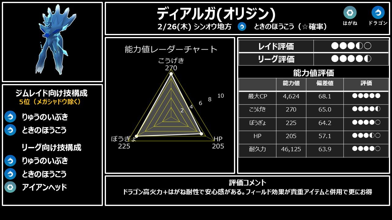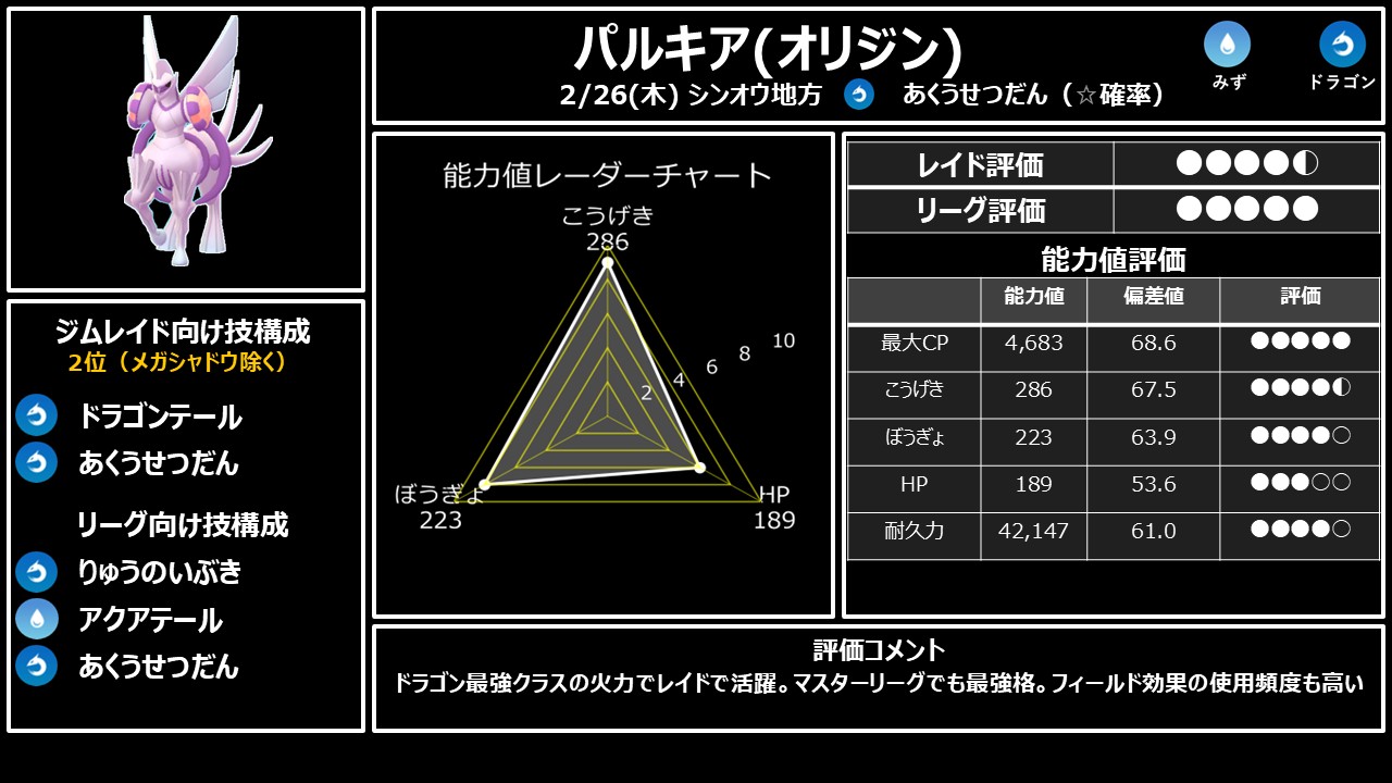 ・2/26(木) シンオウ → オリジンパルキア>ディアルガ。限定技は確率取得(約10〜14%)。多く回すべし
