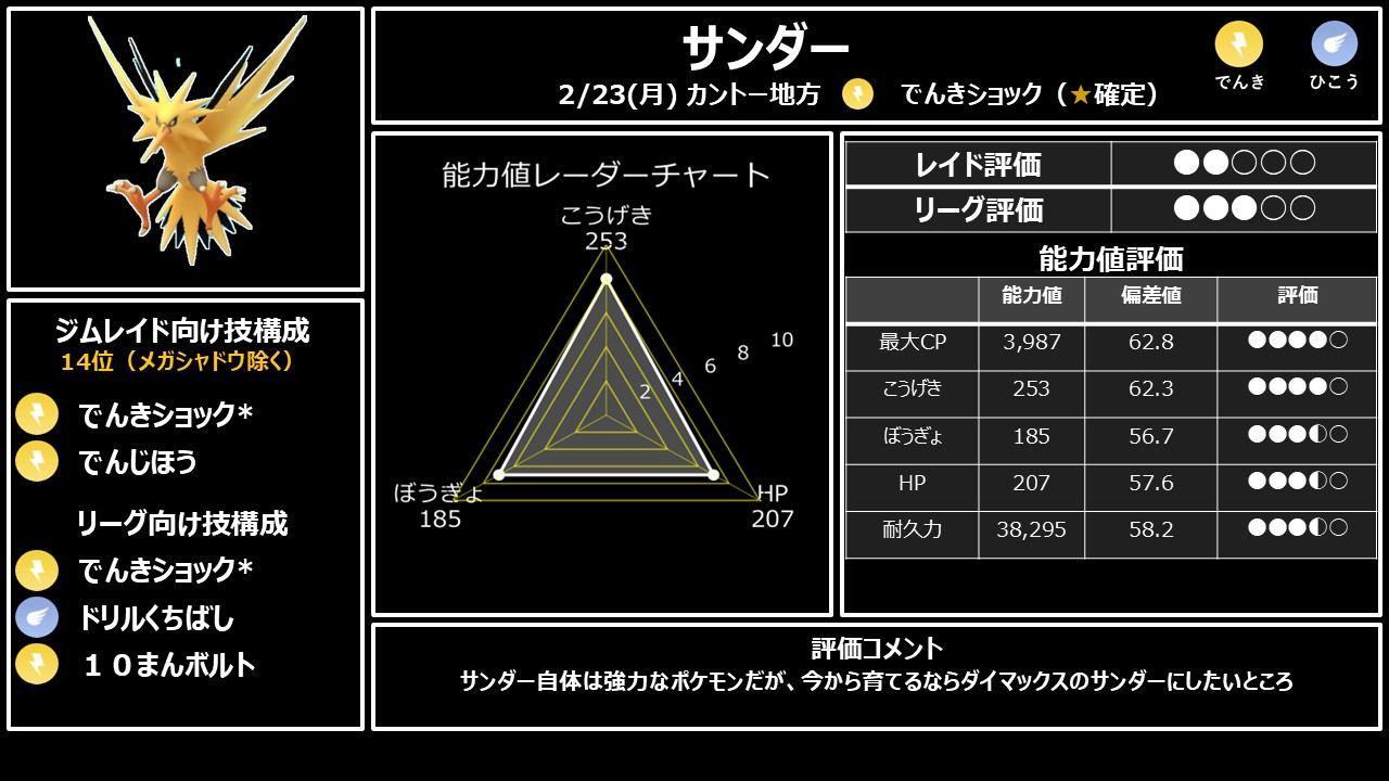 ただし、この4匹は入手難度が高いため、手持ちが薄い方にとってサンダーは十分な戦力になります。