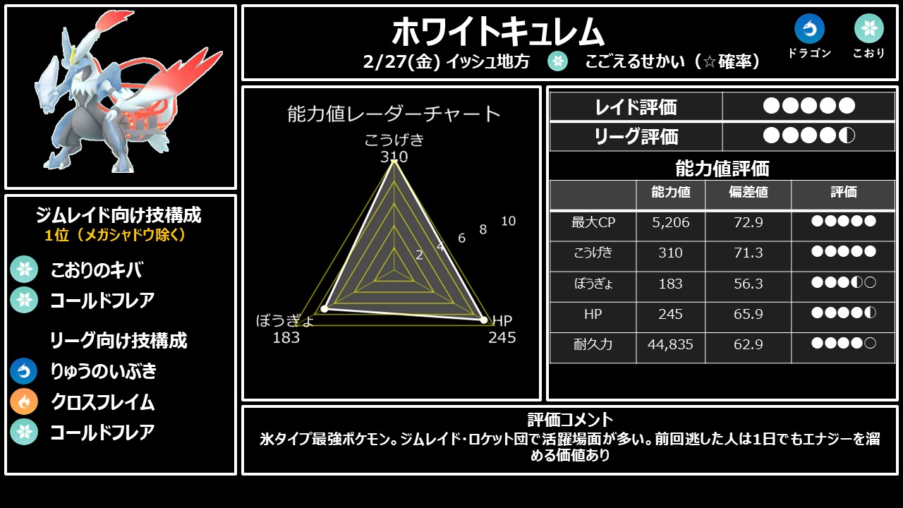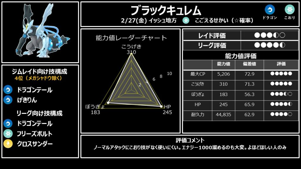 攻撃種族値192は伝説としては低く、コンボDPS 22.08はトップのホワイトキュレム(DPS 29.5)と大差。7匹以上の上位互換が存在します。