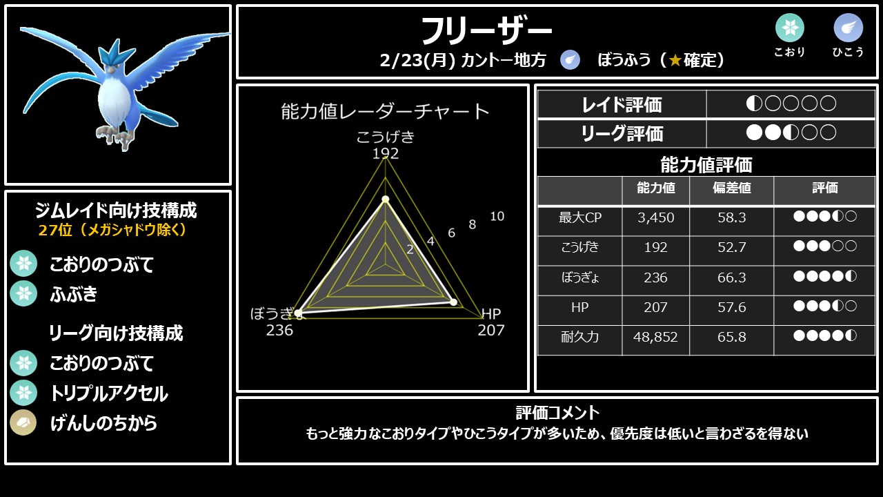 11位: フリーザー ★★☆☆☆|こおりタイプは上位互換が多すぎる