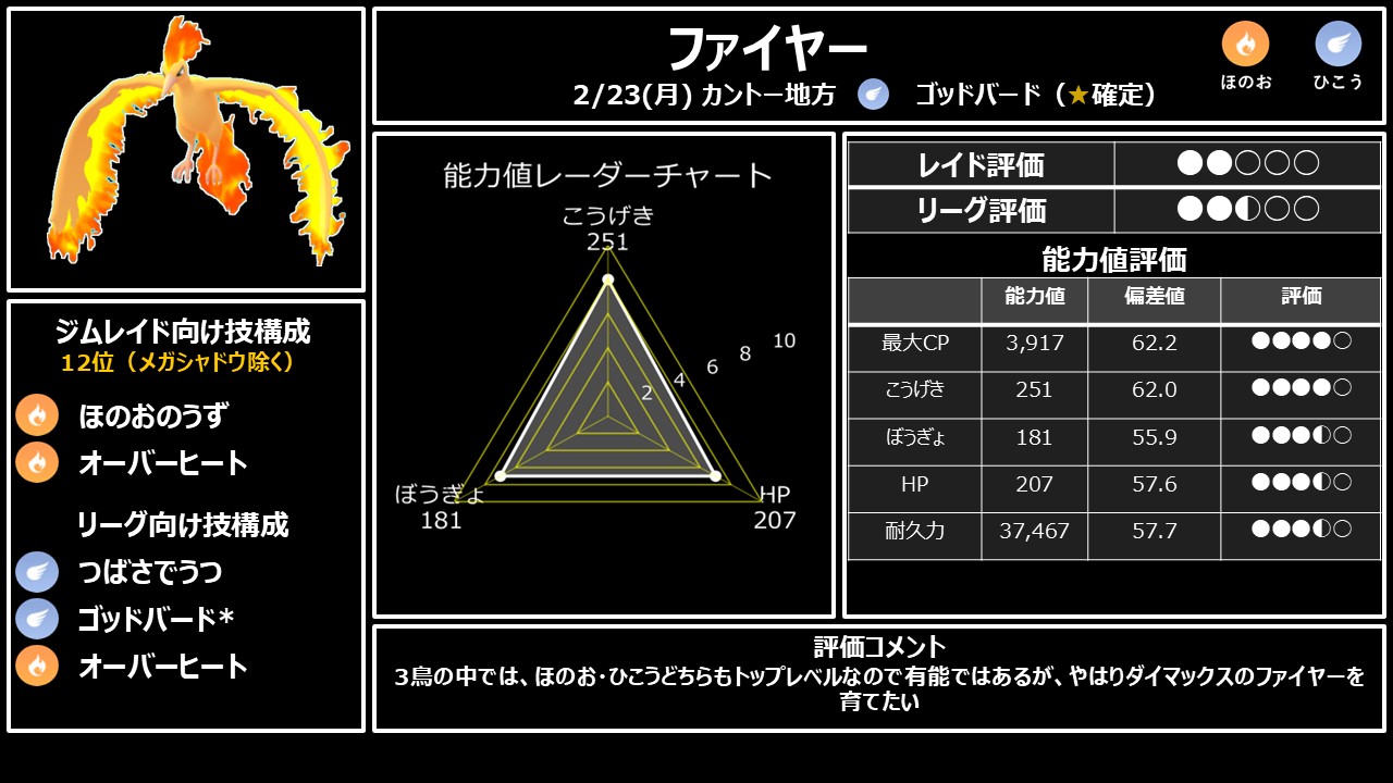 三鳥の中ではダントツの評価です。ほのおタイプ4〜5位(コンボDPS 27.58)であり、さらにレガシー技「ゴッドバード」を持てばメガシンカ除くひこうタイプ最強アタッカーにもなれる二刀流が最大の魅力です。