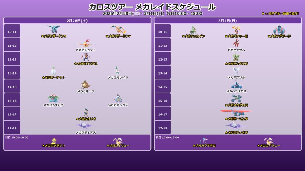 前回の「カロスへの道」は平日5日間の伝説レイドでしたが、今回は土日2日間のメガレイド。しかも1時間ごとにレイドボスがローテーションするため、事前に優先順位を決めておかないと本当に欲しいメガを取りこぼしてしまいます。