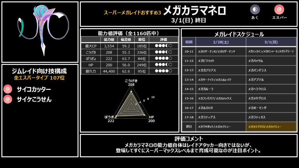レイドアタッカーとしての性能は正直厳しいですが、新実装メガでコレクション価値は高いです。最大の注目ポイントはスーパーマックスレベルの初対象であること。登場してすぐにスーパーマックスレベルまで育成可能です。