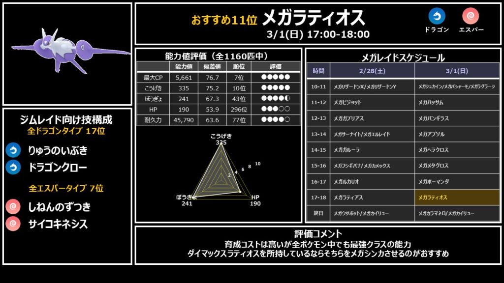 育成コストは高いが全ポケモン中でも最強クラスの能力を持つメガシンカ。ドラゴンタイプは激戦区のため17位に沈むものの、能力値自体は非常に高く、エスパータイプ7位としても運用可能です。