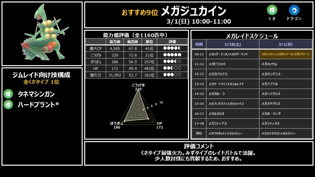 新実装メガながらくさタイプ火力ランキング3位・どくタイプ4位と実は高火力。1位のメガジュカインには劣りますが十分な火力で、レイドバトルでしっかり活躍できます。