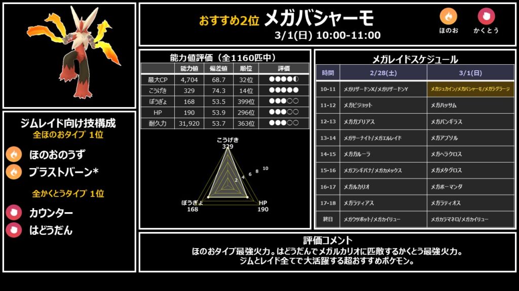ジムとレイド全てで大活躍する超おすすめポケモン。ブラストバーンはコミュニティデイ技のため、すごいわざマシンスペシャルが必要です。在庫と相談して判断しましょう。日曜10時にジュカイン・ラグラージと同時出現する最重要枠です。
