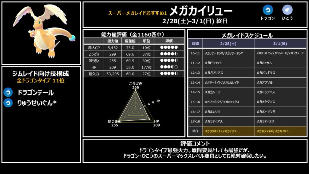 りゅうせいぐんはコミュニティデイ技ですが、げきりんでもほぼ同じ火力が出るため、すごいわざマシンが足りない場合はげきりんで代用可能です。両日とも終日出現なので、複数匹確保して個体厳選もできます。