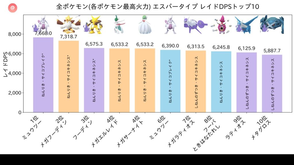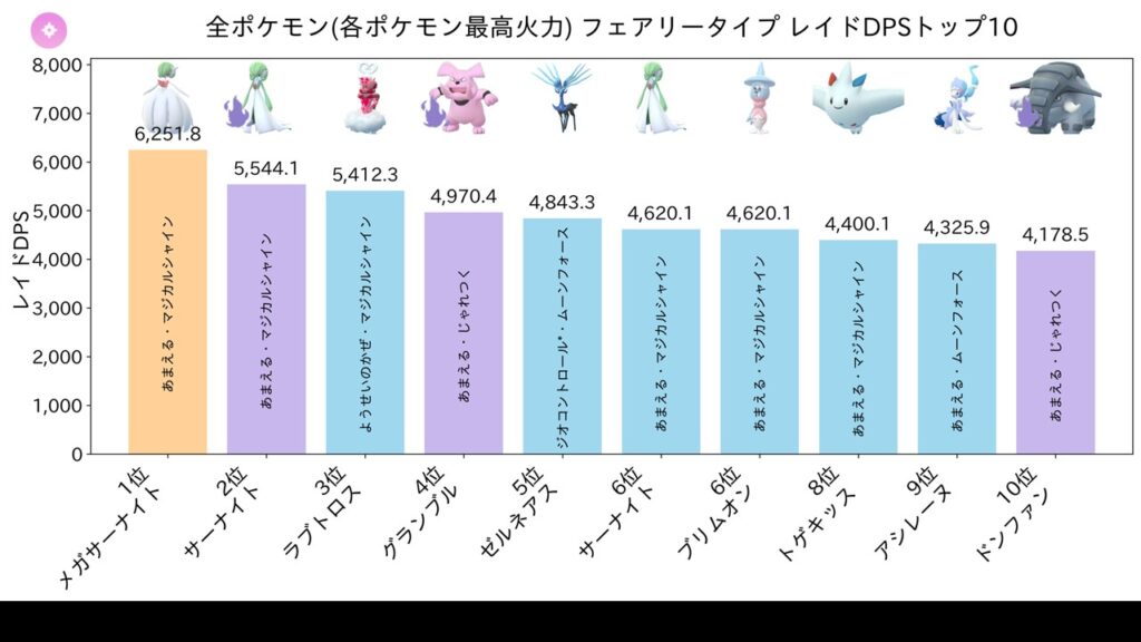 フェアリータイプ火力ランキングで堂々の1位。2位に大差をつけており、フェアリーアタッカーとして圧倒的な存在です。ドラゴンレイドの少人数討伐で無類の強さを発揮します。エスパータイプでも4位に入り、ミュウツーやメガフーディンに次ぐ実力。フェアリーのアメと経験値ブースト要員としても唯一無二の存在です。