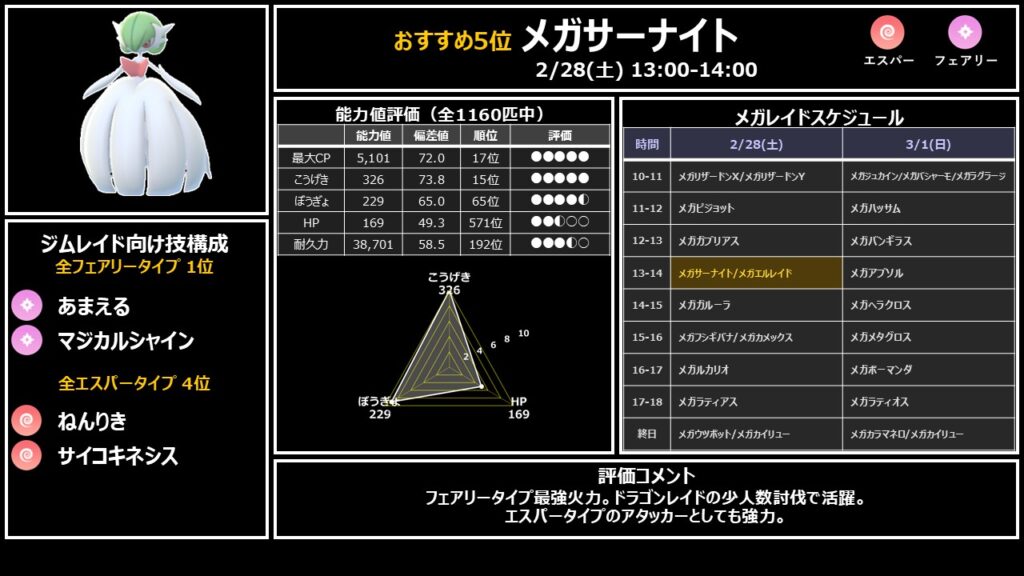 他にフェアリータイプのメガシンカがいないため替えが効かないポケモン。土曜13時の枠で最優先確保です。
