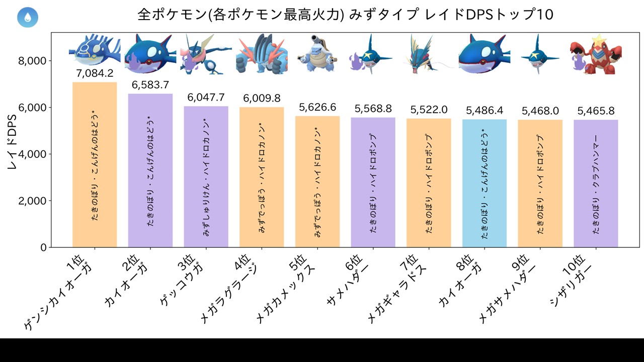 みずタイプ火力ランキングでは4位。ゲンシカイオーガが圧倒的1位ですが、メガシンカ勢では最上位クラスの実力です。ゲンシカイオーガ未所持なら優先度が高く、なみのりでも十分な火力があるため始めたばかりのトレーナーにもおすすめです。スーパーメガレイドではゲンシカイキだとシールドを割れないため、みずメガとしての価値もさらに高まります。