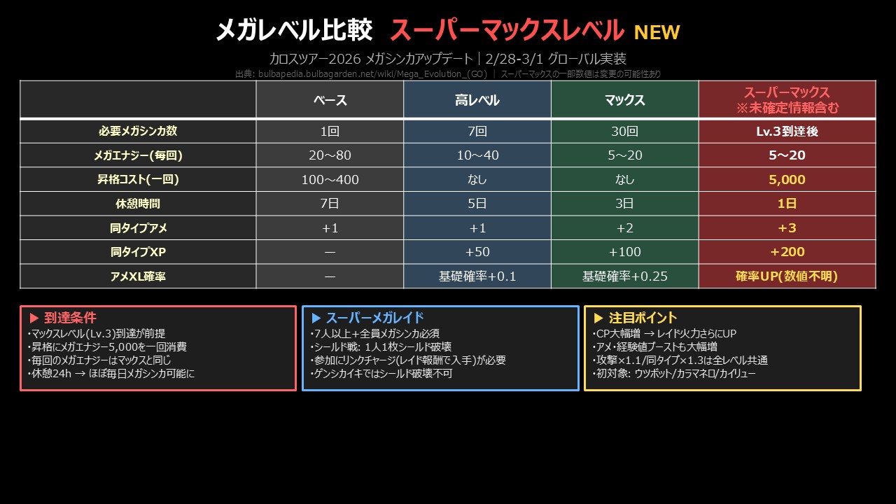 さらに新メガシンカとしてメガウツボット・メガカラマネロ・メガカイリューが初登場。新システム「スーパーマックスレベル」も同時実装される注目イベントです。
