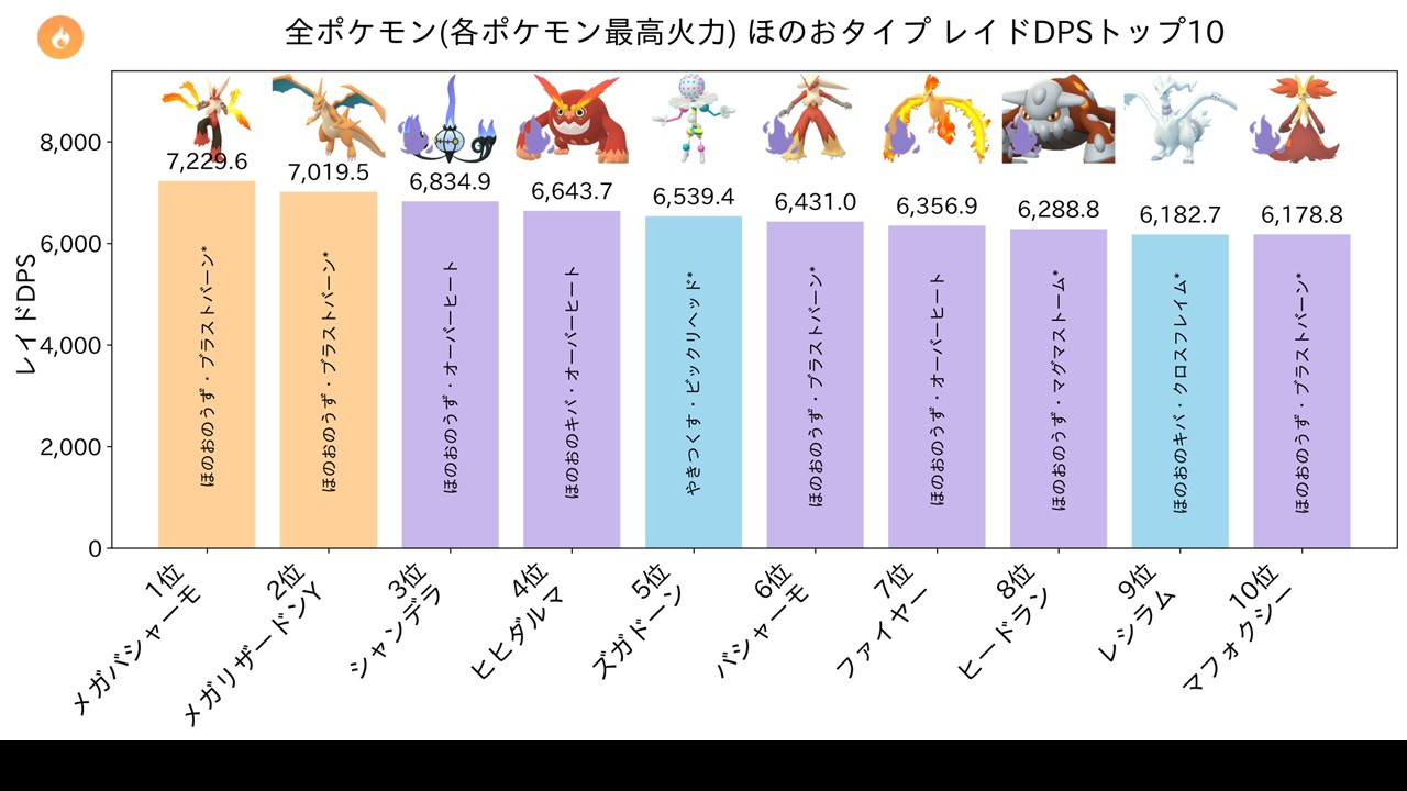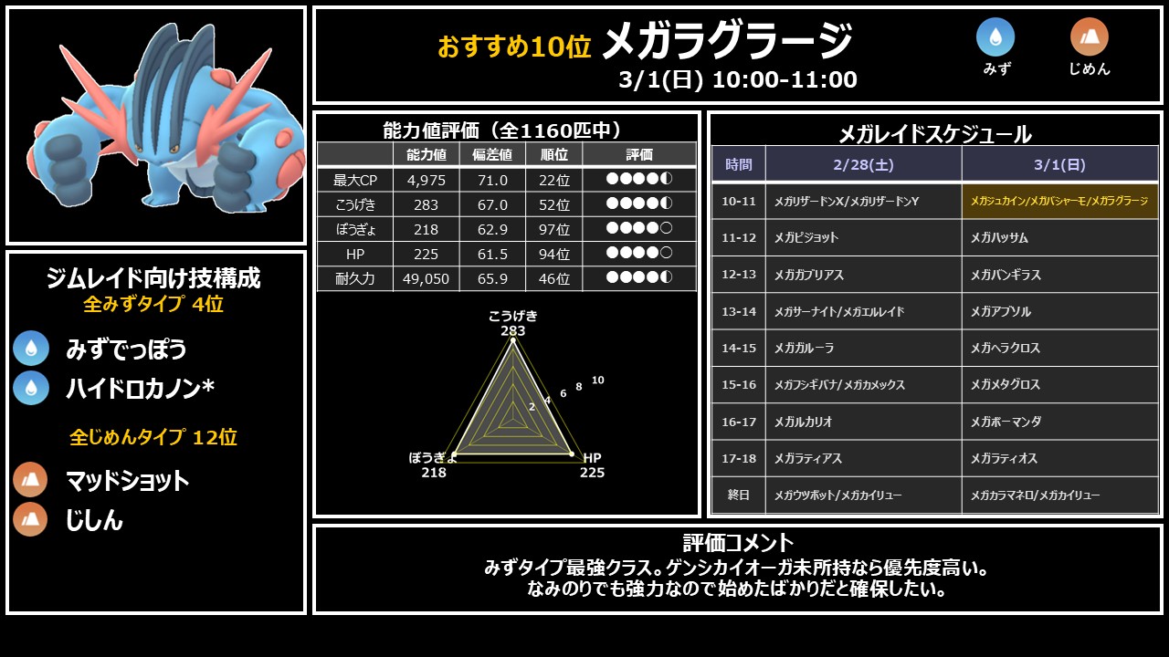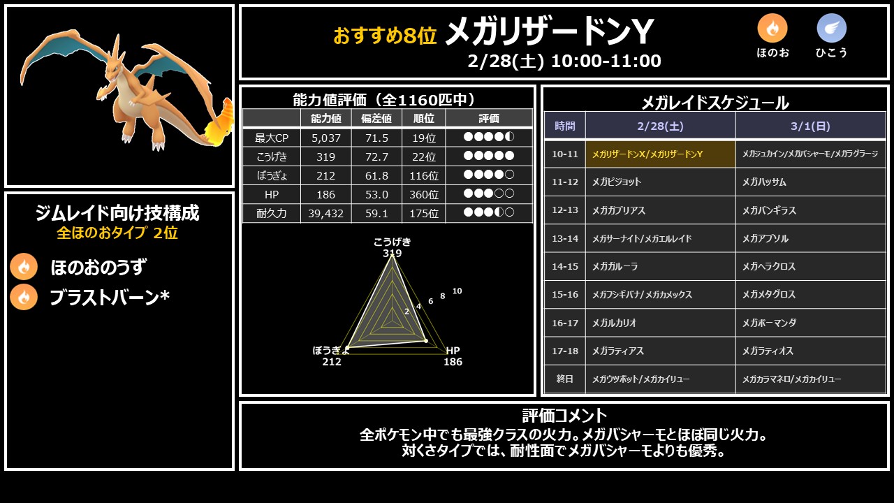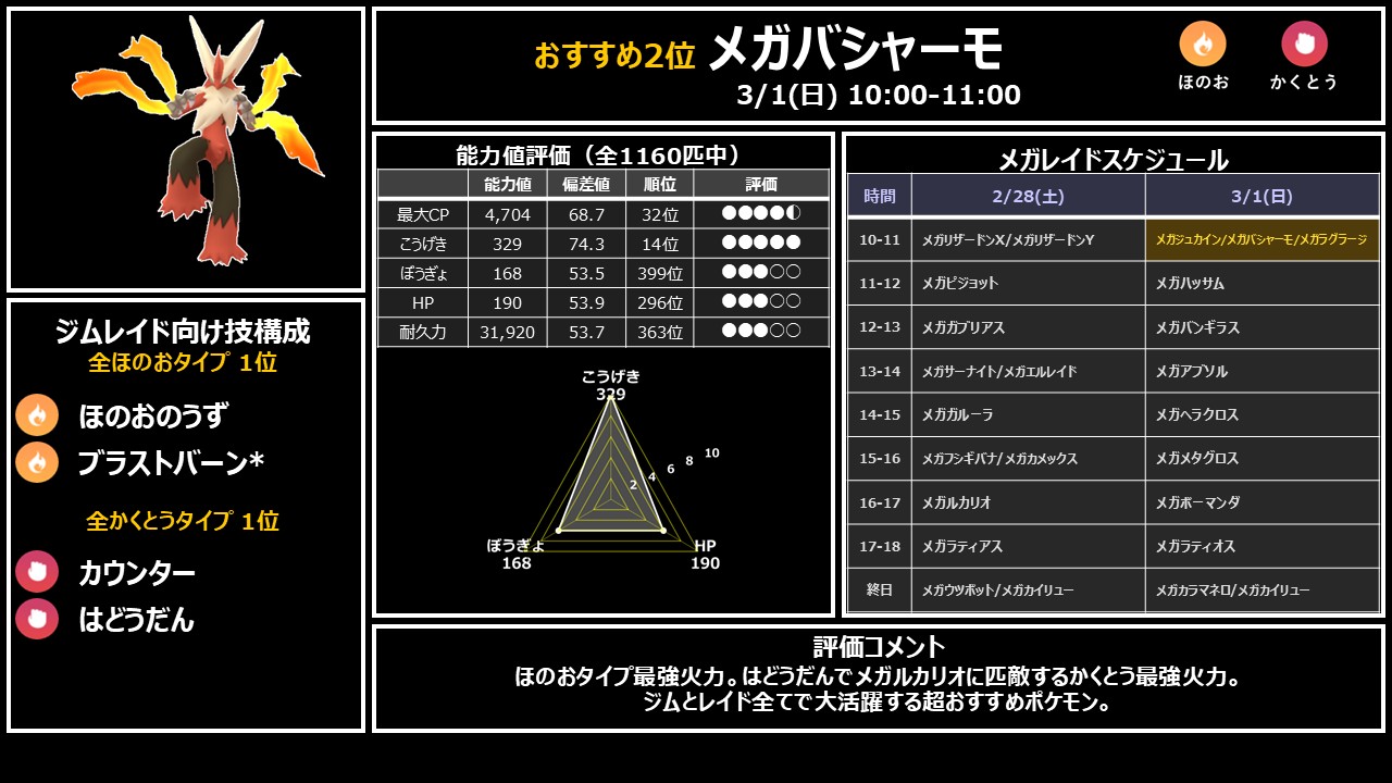 ジムとレイド全てで大活躍する超おすすめポケモン。ブラストバーンはコミュニティデイ技のため、すごいわざマシンスペシャルが必要です。在庫と相談して判断しましょう。日曜10時にジュカイン・ラグラージと同時出現する最重要枠です。