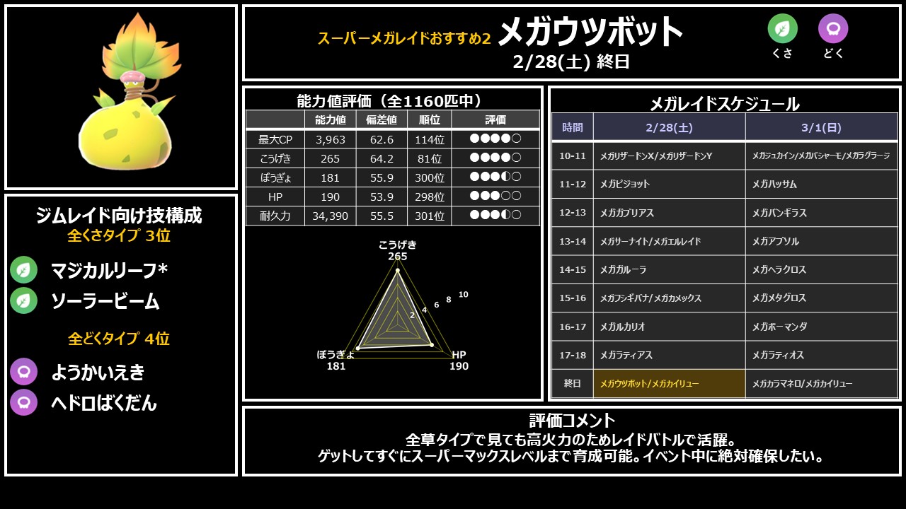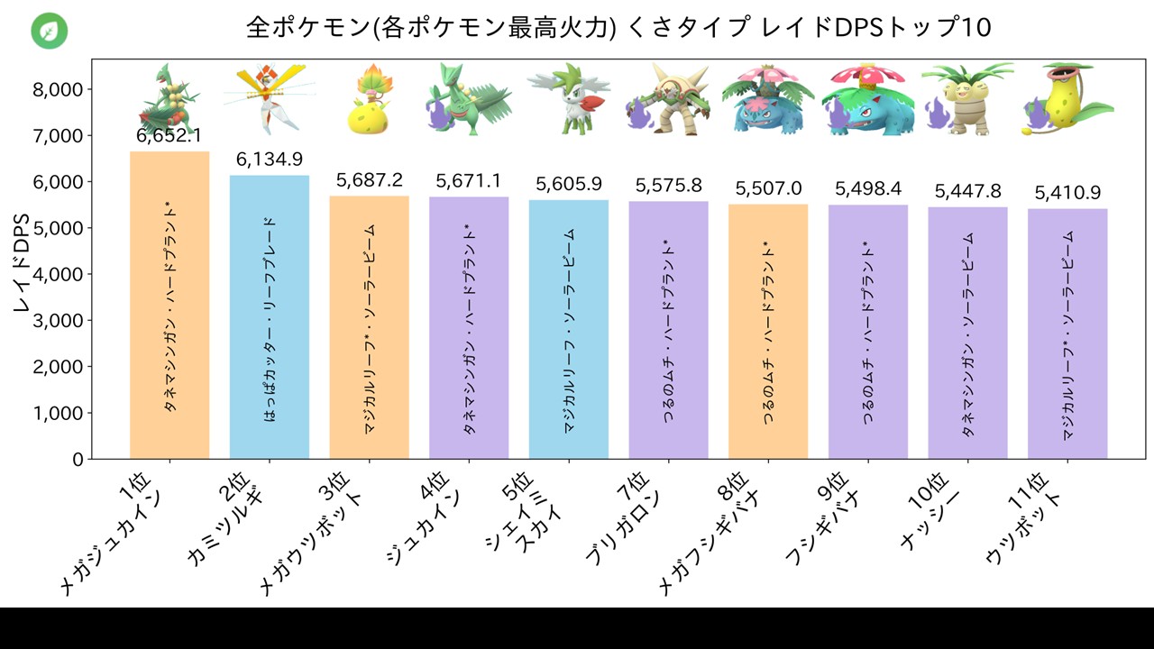新実装メガながらくさタイプ火力ランキング3位・どくタイプ4位と実は高火力。1位のメガジュカインには劣りますが十分な火力で、レイドバトルでしっかり活躍できます。