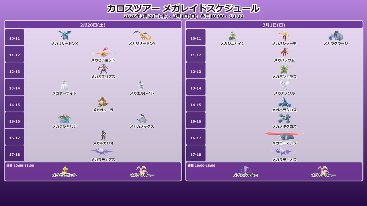 前回の「カロスへの道」は平日5日間の伝説レイドでしたが、今回は土日2日間のメガレイド。しかも1時間ごとにレイドボスがローテーションするため、事前に優先順位を決めておかないと本当に欲しいメガを取りこぼしてしまいます。