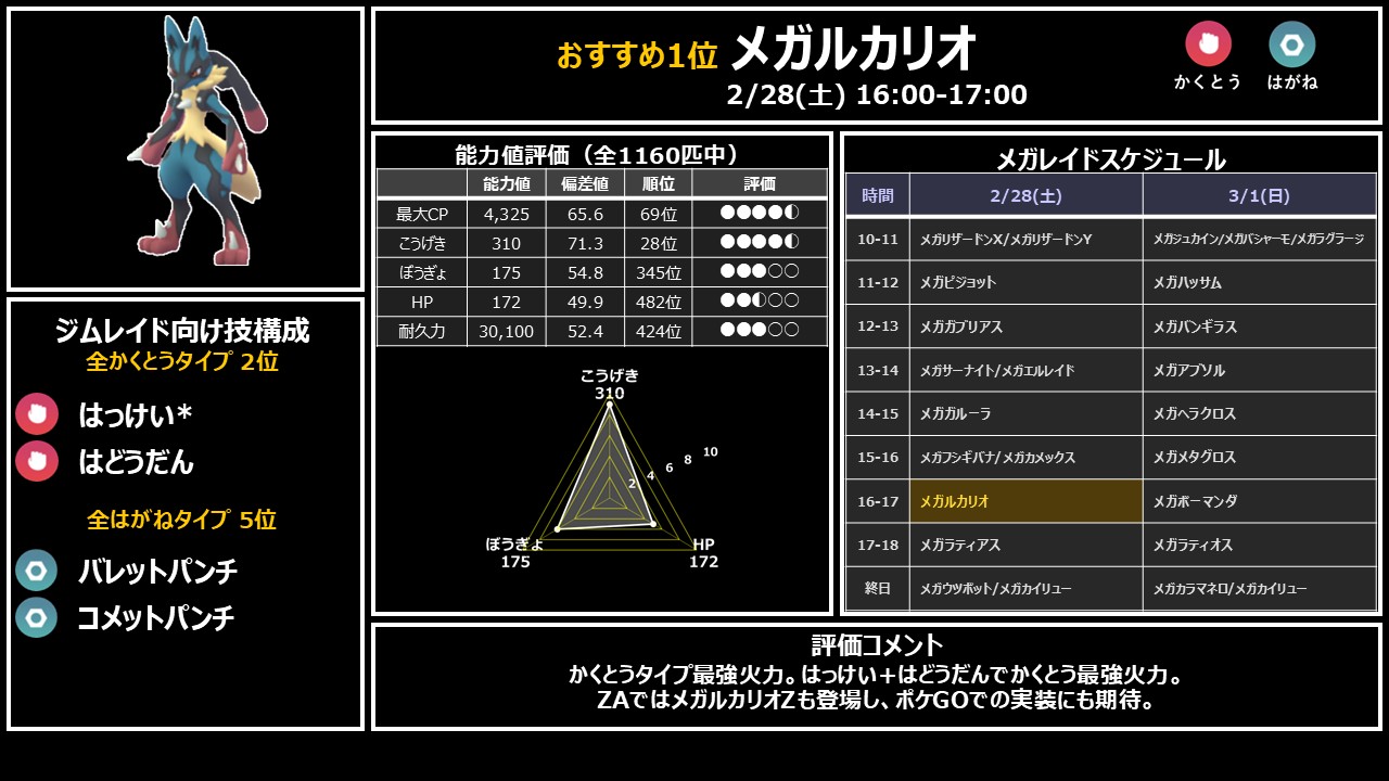 かくとうタイプのメガシンカはルカリオだけのため、替えの効かない唯一無二の存在。ZAではメガルカリオZも登場しており、ポケGOでの実装にも期待が高まります。土曜16時の単独枠で絶対に確保しましょう。