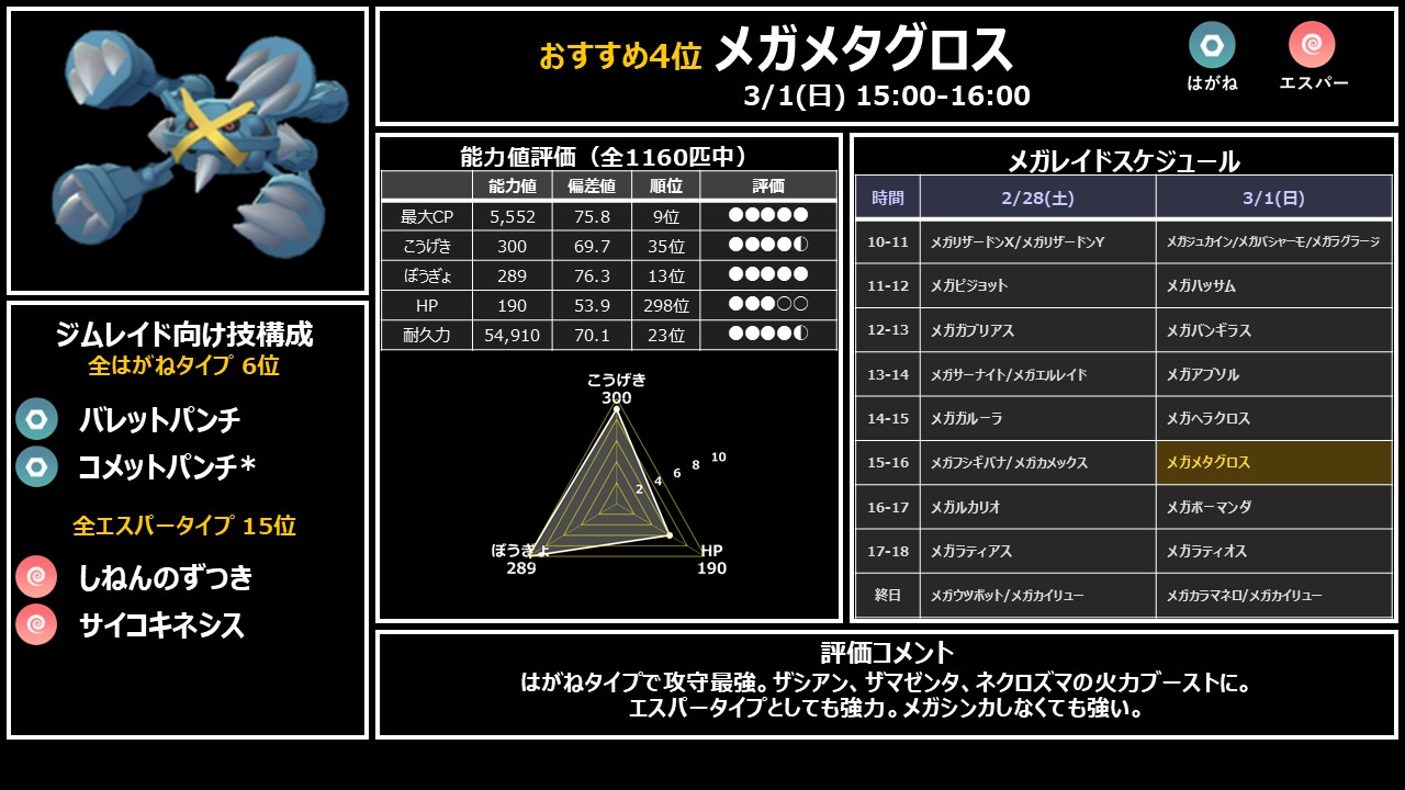 優先 15時: メガメタグロス → はがね攻守最強・伝説レイド適性