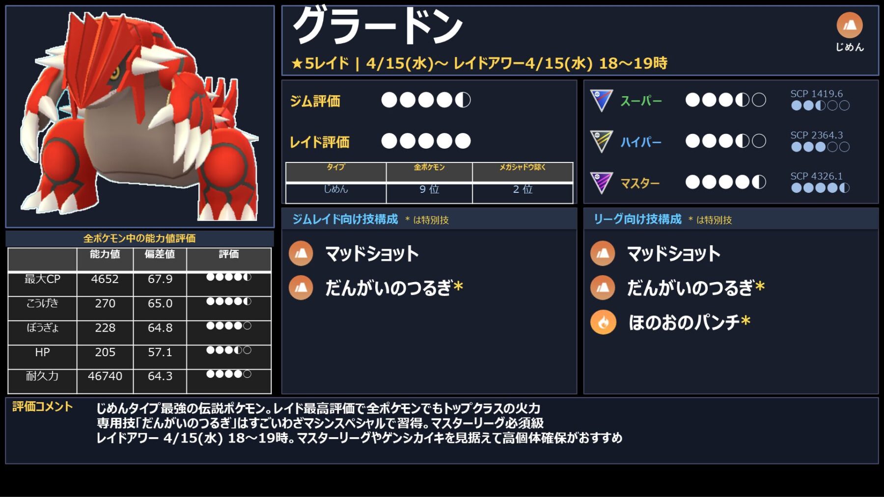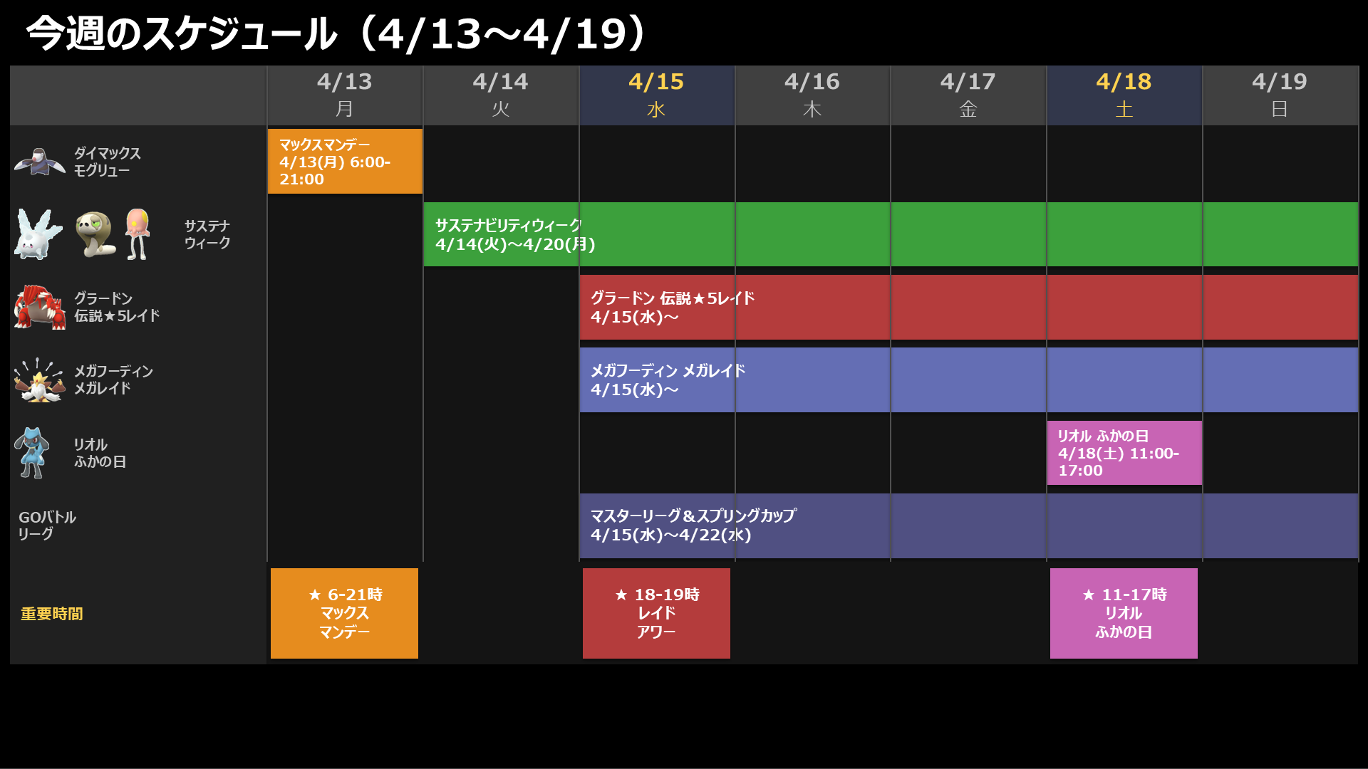 - 4/15(水)18〜19時:レイドアワー(グラードン集中出現)