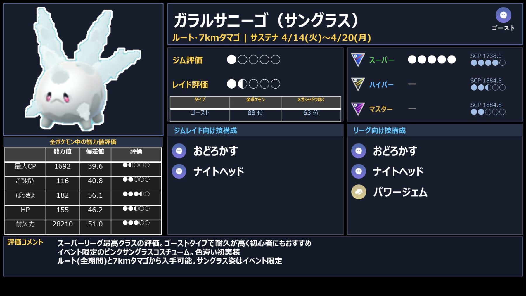 今回のサングラスバージョンはイベント限定のコスチューム実装で、色違いも今回が初実装です。活躍の中心はスーパーリーグなので、進化させずにキープするのが基本になります。まずはサングラスのガラルサニーゴを集めることを最優先にしましょう。