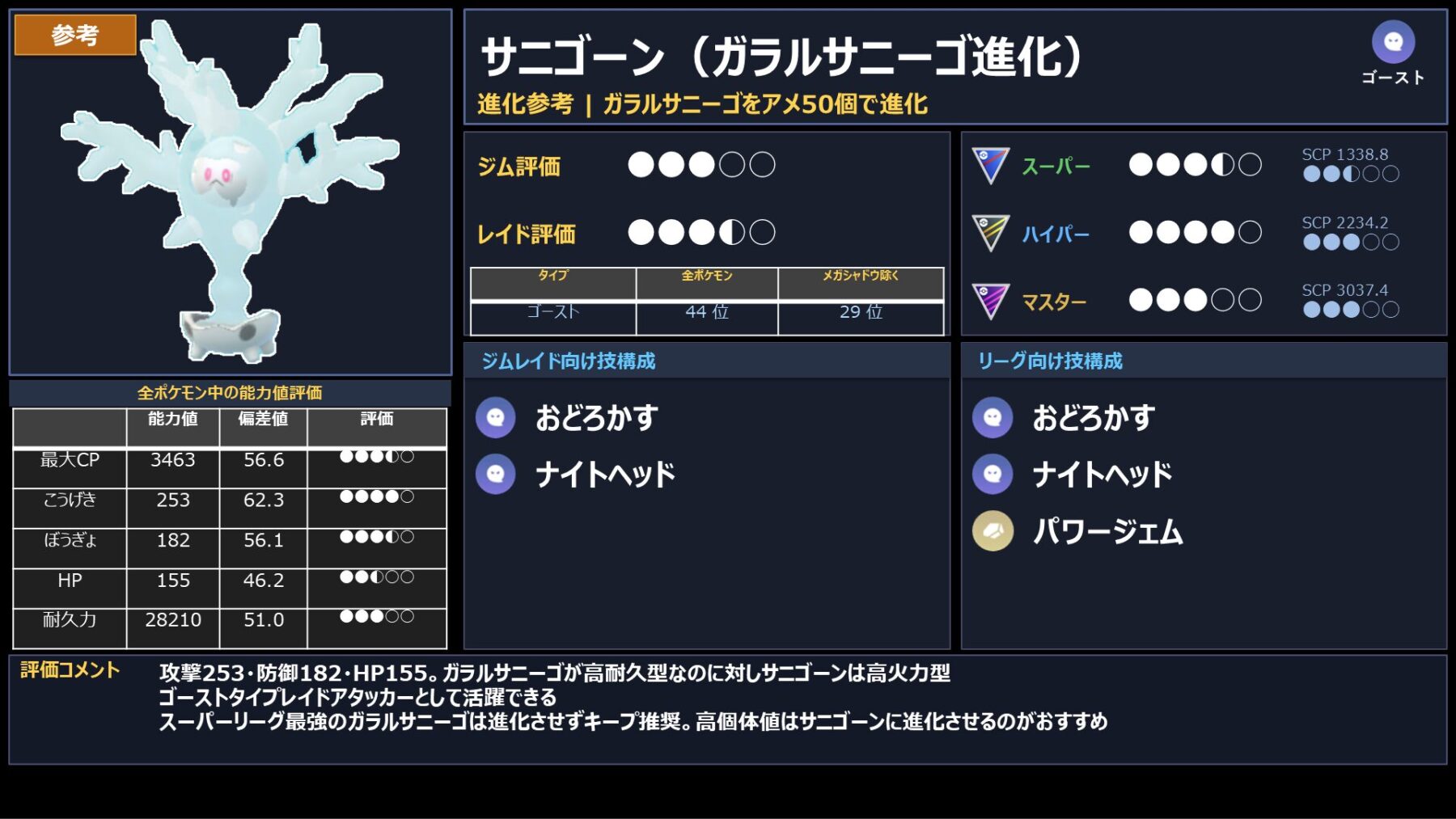 進化系のサニゴーンは攻撃種族値253の高火力ゴーストタイプレイドアタッカーとして優秀です。ガラルサニーゴが耐久型なのに対して、サニゴーンは高火力型という違いがあります。スーパーリーグで使うならガラルサニーゴのままキープが正解ですが、余裕があれば進化個体も育てておく価値があります。