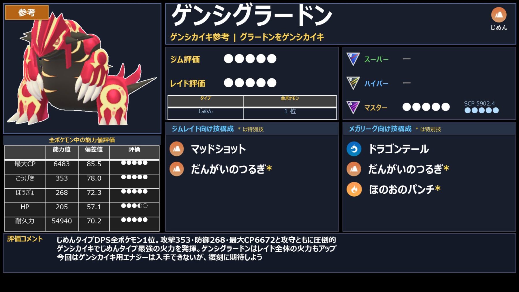 ゲンシグラードンはゲンシカイキしたグラードンで、じめんタイプ全ポケモン中1位の火力を誇ります。ただし今回のレイドではゲンシカイキ用のエナジーは手に入りません。今週は本体の個体値厳選とアメ集めを進める週と考え、将来の復刻に備えておくのがよいでしょう。
