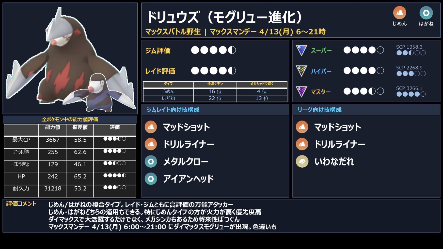 - 第2位:ドリュウズ(モグリュー)→ 4/13マックスマンデーが勝負・まずはじめん運用で確保