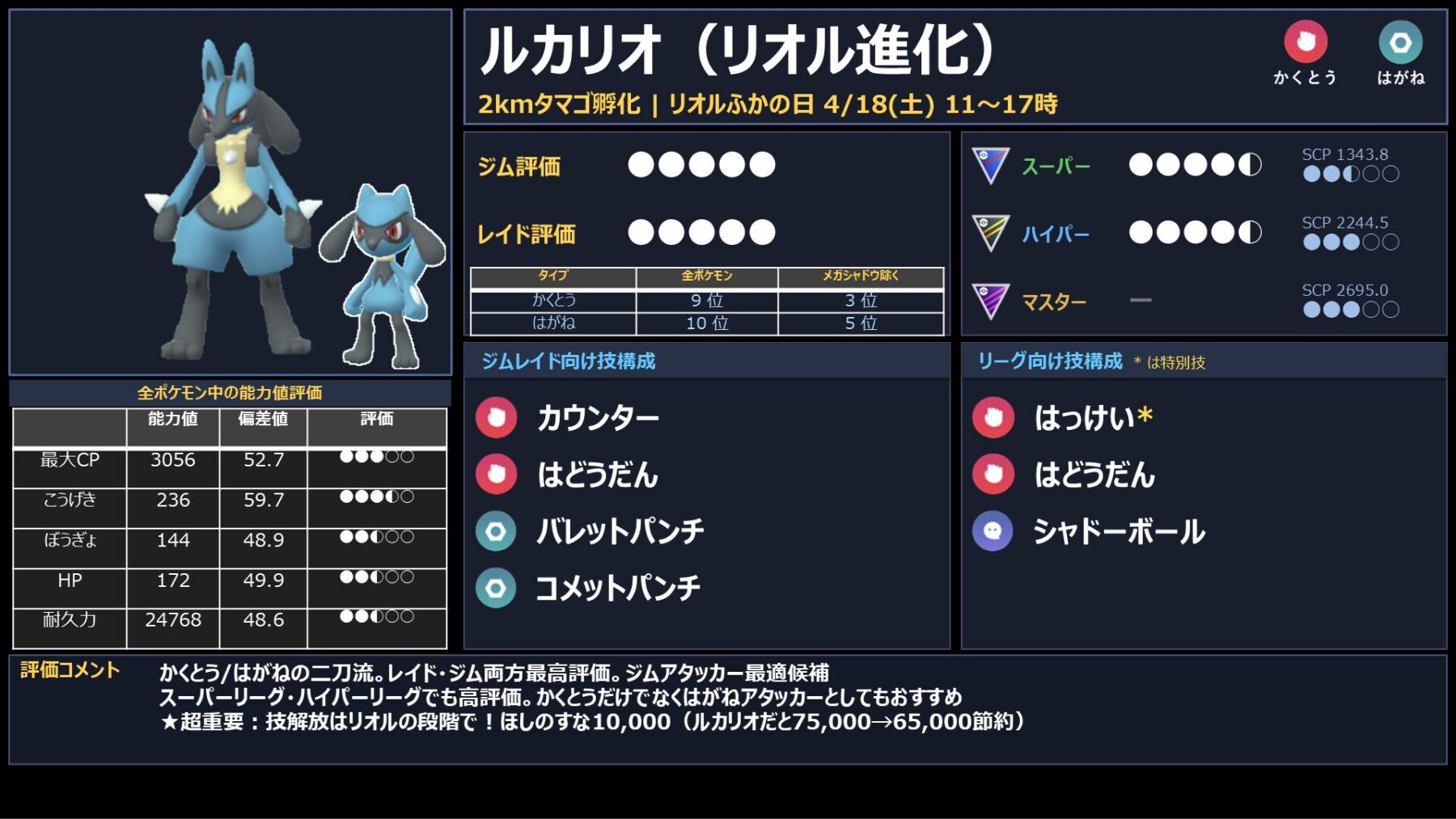 ルカリオはレイド・ジム・バトルリーグすべてで活躍できる超優秀なポケモンです。初心者でも育てる価値がわかりやすい1匹です。