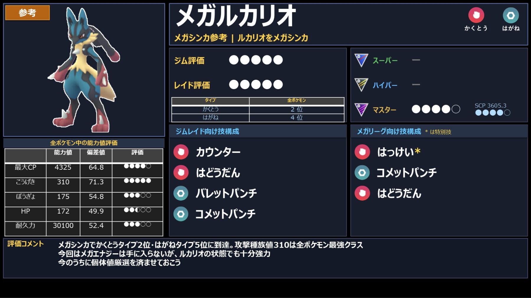 メガ進化を見据えるならメガルカリオも非常に強力です。かくとう・はがね両タイプで全ポケモン最強クラスの火力を誇ります。今回のふかの日ではメガエナジーは手に入りませんが、今のうちに高個体のルカリオを厳選しておくことで将来のメガシンカに備えられます。