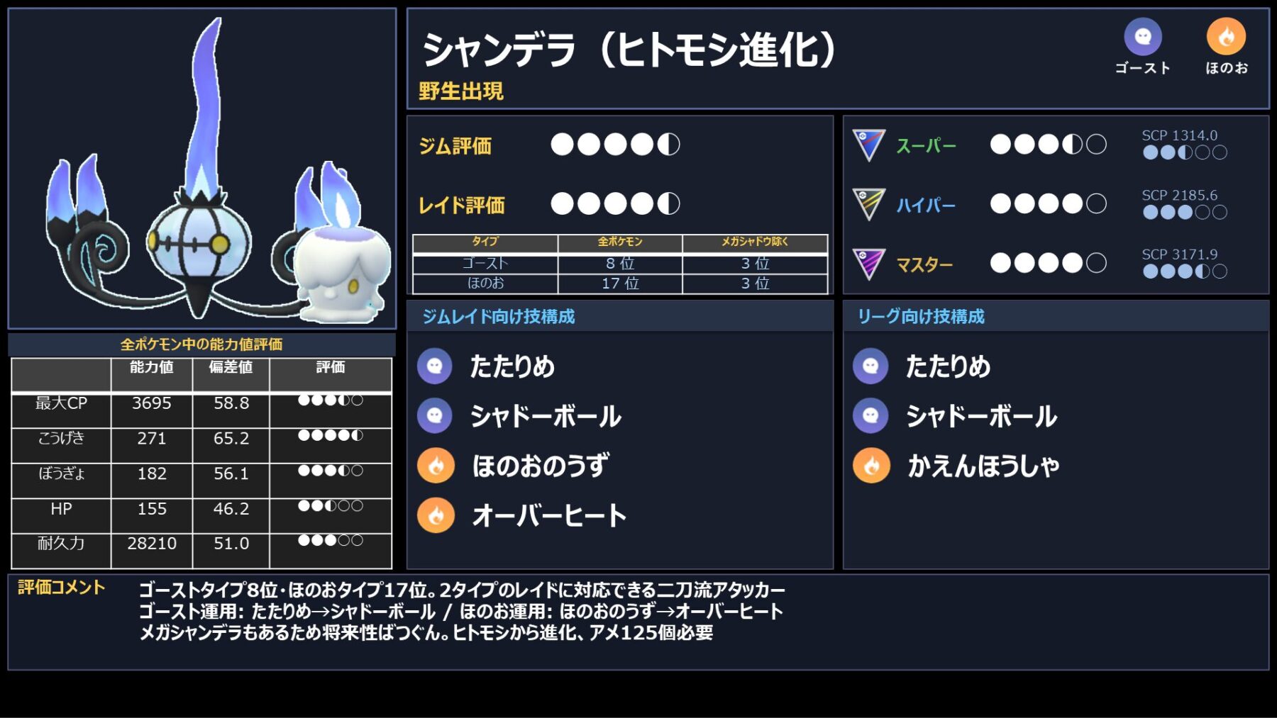 ゴーストとほのおの両方で最強クラスの火力を出せる二刀流アタッカーで、レイド・ジム評価ともにS以上の優秀なポケモンです。ゴースト運用はたたりめからシャドーボール、ほのお運用はほのおのうずからオーバーヒートが基本です。ヒトモシから進化するのにアメが125個必要なため、見かけたら毎回捕まえておく習慣をつけましょう。将来のメガシャンデラも見据えると長期的な価値も高いです。
