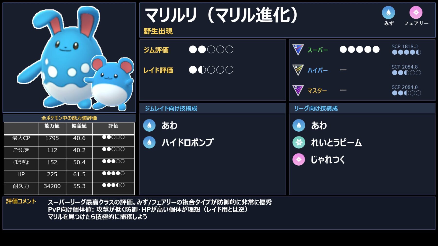 みずとフェアリーの組み合わせが防御面で非常に優秀で、スーパーリーグで最強クラスの評価を誇ります。対人戦向けは攻撃値低め・防御値とHP高めの個体が理想です(レイド用とは欲しい個体値が逆になる点に注意)。マリルを見かけたら積極的に確保しておきましょう。