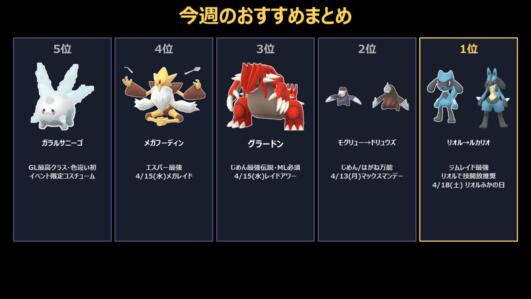 - 第1位:ルカリオ(リオル)→ 4/18ふかの日・技解放はリオルのうちに(65,000節約)