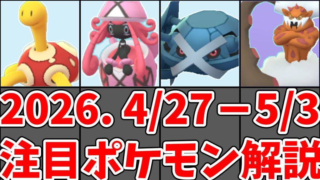 ドクターごごちです。ご覧いただきありがとうございます。 2026年4月27日〜5月3日のポケモンGOで優先すべきポケモンをまとめます。 今週の最大の目玉は、5月2日(土)14:00〜17:00 の3時 … 続きを読む 【ポケモンGO】4/27〜5/3今週やること|シャドウエンテイ レイドデイ・シャドウエンテイ評価・はがねの決意2026・シャドウランドロス評価